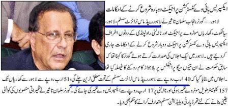 “Sources associated with the project told Daily Times on Thursday that this (Rs 125-Rs 140) one-side fare had been calculated after taking into account the rendered $2.5 billion cost of the project, which is expected to be completed by 2011. Sources said that to pay back the loan likely to be incurred on the LRMT project, the government would have to charge high fares from the passengers. Currently, the public transport fare from Kahna to Shahdara is between Rs 20 to 25. By 2011, it would rise between Rs 25 and Rs 30. They said that to charge a passenger of the LRMT Rs 30 for a one-side visit, the government would have to give a subsidy of at least Rs 100 per person, which was not possible for the government.
