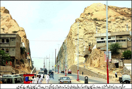 A road connecting Block T of North Nazimabad with Orangi has been built by a deep cut through the hills. This photo appears in today’s Jang