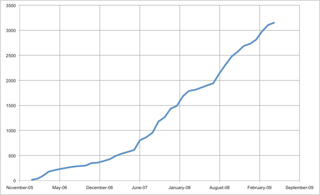 Here’s a graph showing the death toll in Pakistan since Jan 2006 to May 22nd 2009. The total is 3151 deaths.